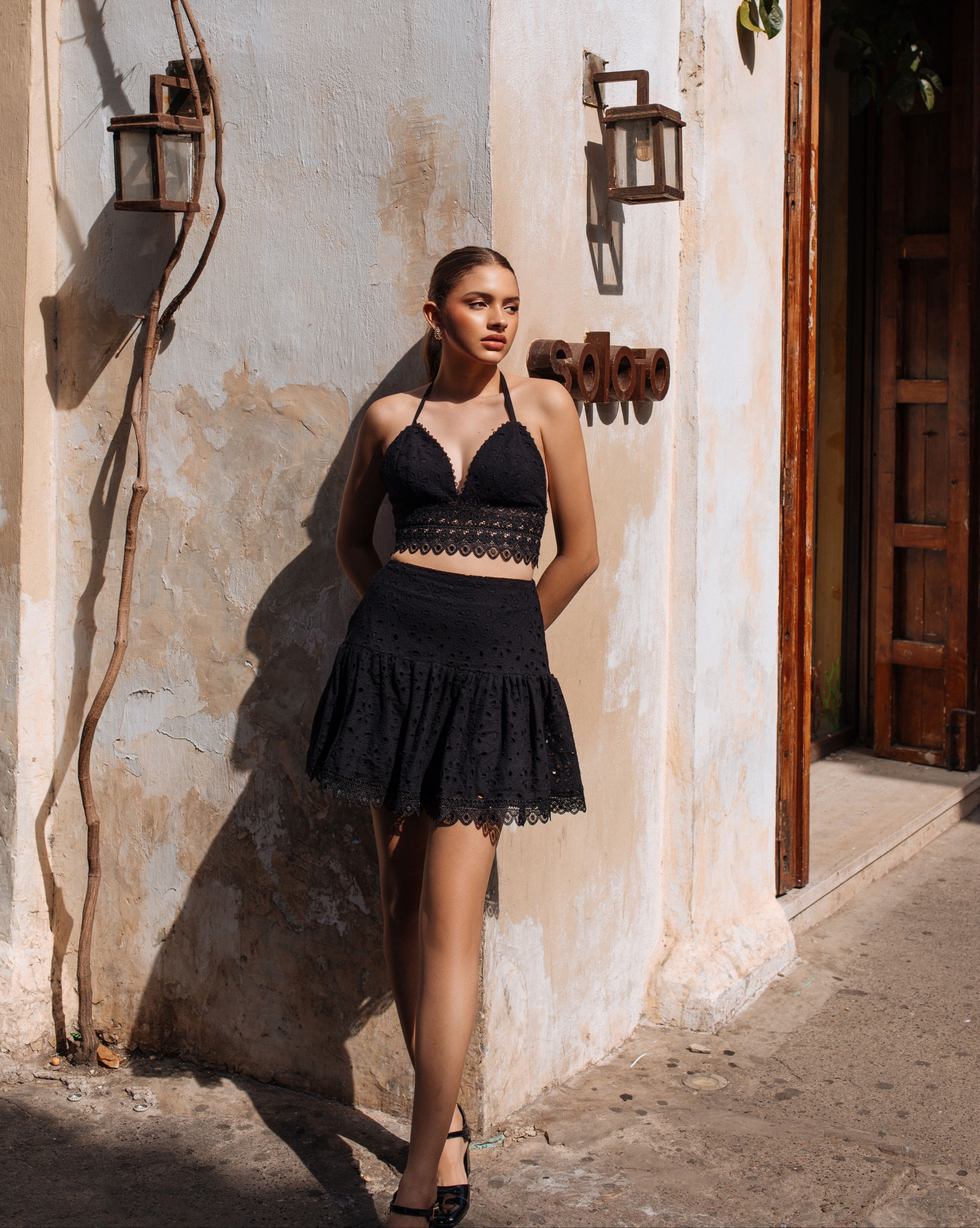 Set Bordado Heredado en negro profundo compuesto por top y falda corta, confeccionado en ojalillo con bordados tradicionales. Revela un equilibrio entre la sensualidad femenina y la herencia textil atemporal.