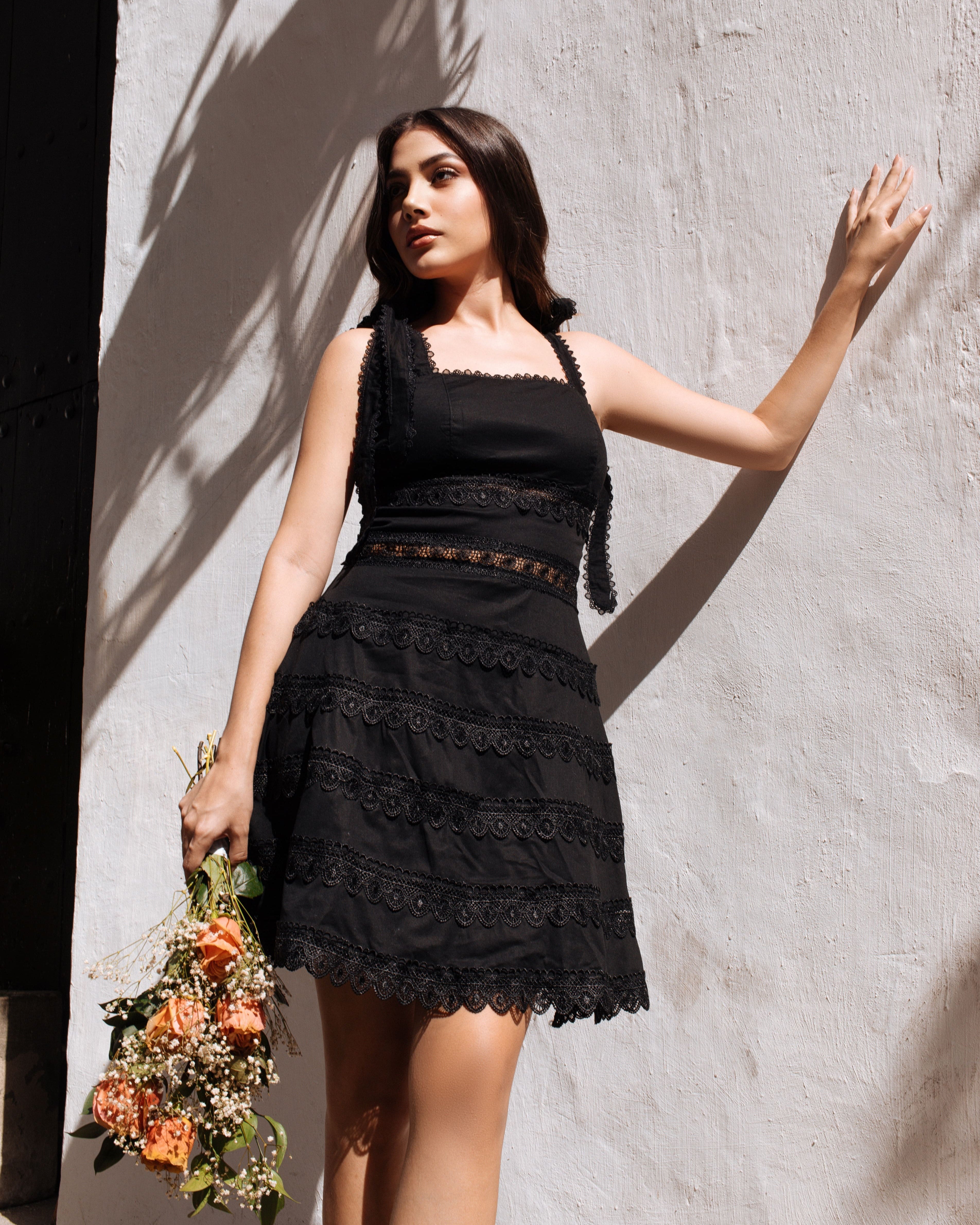 Vestido Flor de Costura con apliques de encaje negro. Su estructura entallada y los detalles realzan la silueta con elegancia atemporal.