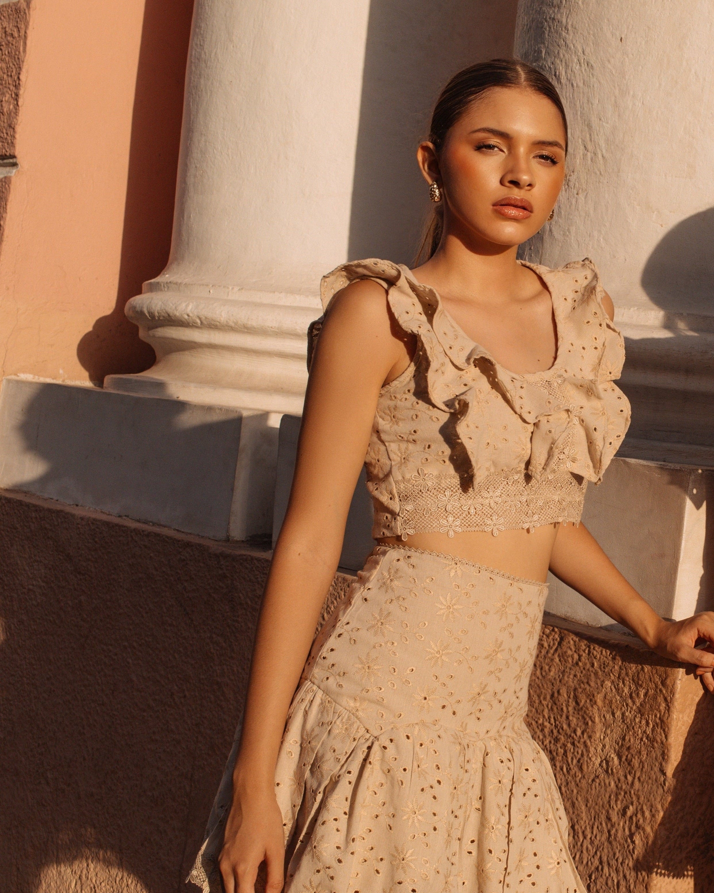 Flor de Ojalillo, confeccionado en ojalillo 100% algodón en tono beig, el top y la falda combinan la delicadeza. El top con un escote cuadrado con volantes y detalles de encaje blanco con una falda de cintura alta y vuelo sutil que realza la silueta con frescura y feminidad.