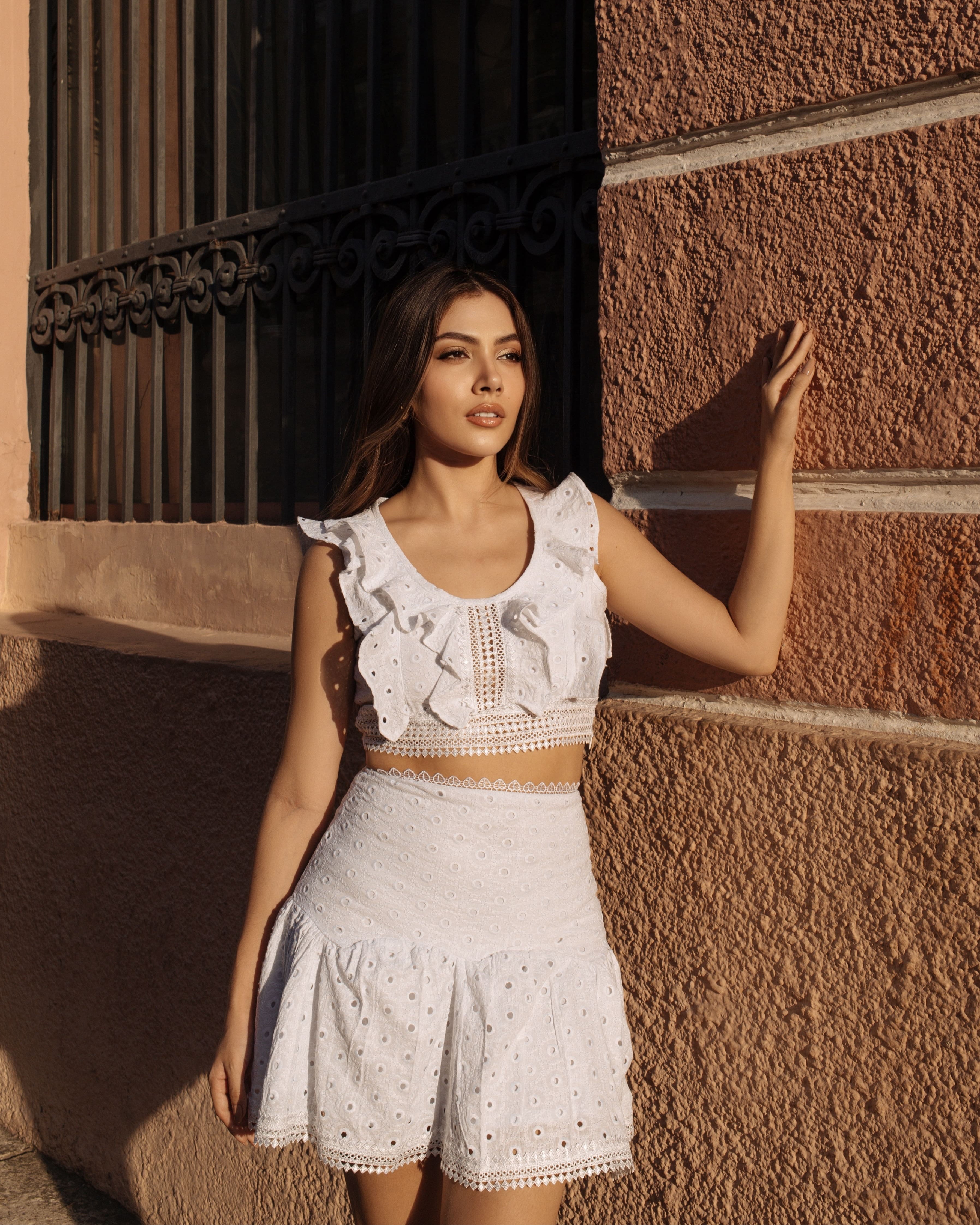 Set Flor de Ojalillo Blanco, confeccionado en ojalillo 100% algodón en tono rosa pastel, el top y la falda combinan la delicadeza. El top con un escote cuadrado con volantes y detalles de encaje blanco con una falda de cintura alta y vuelo sutil que realza la silueta con frescura y feminidad.