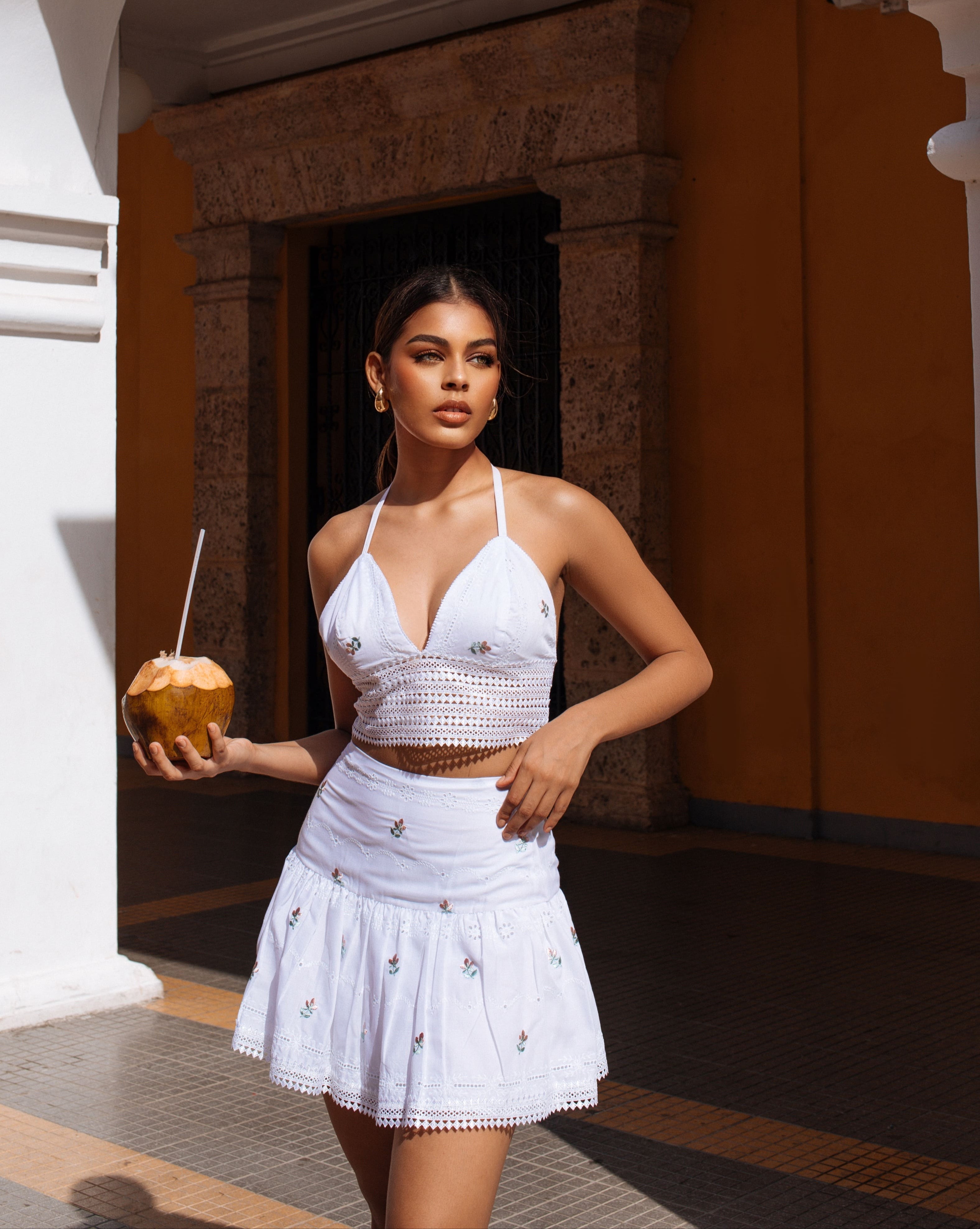 Set Bordado Heredado en blanco profundo compuesto por top y falda corta, confeccionado en ojalillo con bordados tradicionales. Revela un equilibrio entre la sensualidad femenina y la herencia textil atemporal.