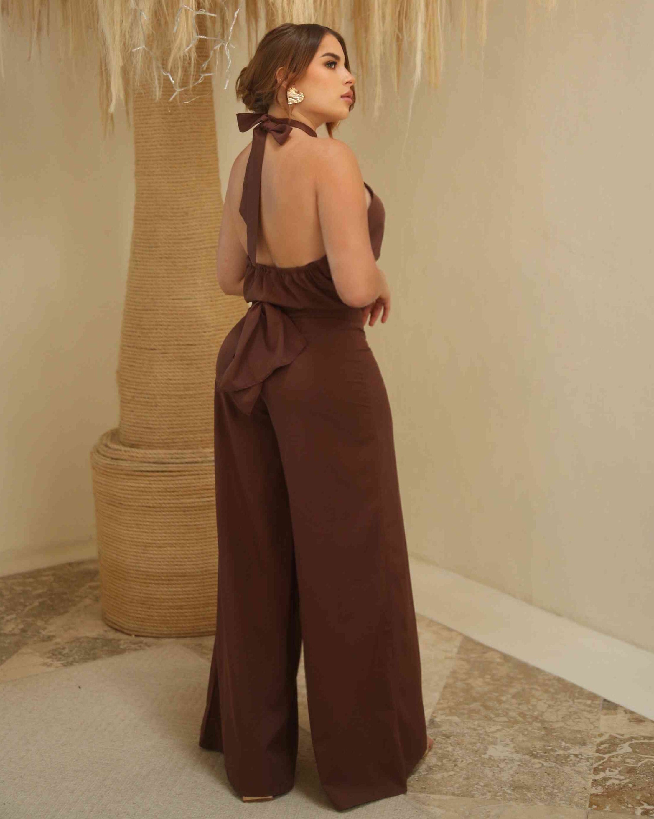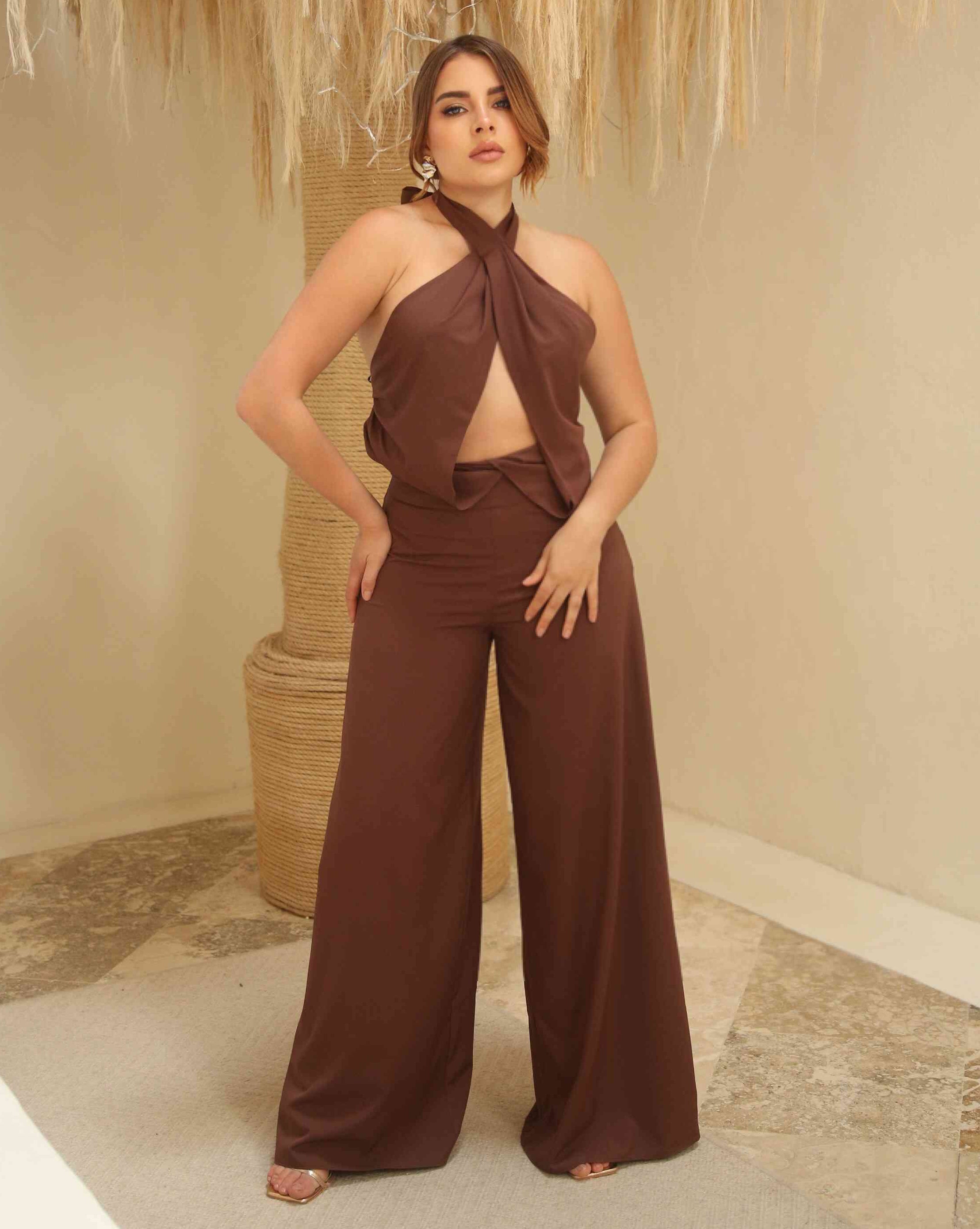 Nuez de Caramelo, un set que envuelve la silueta con la calidez y la elegancia de los tonos tierra. Su top cruzado al frente crea un escote sofisticado y sensual, mientras la espalda descubierta se anuda con un lazo que aporta un aire femenino y envolvente. El pantalón de tiro alto y bota amplia estiliza la figura y aporta movimiento, logrando un look equilibrado entre sutileza y carácter.